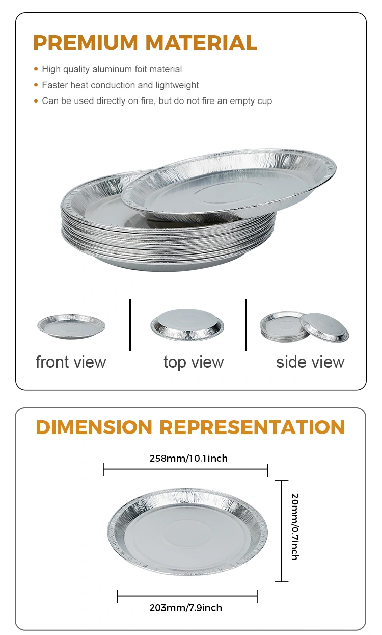 Иунцху алуминијумска фолија нуди 10 инча ПИЗЗА ПАН сребрних алуминијумских фолије са моделом број 13110. Производ има горњи пречник од 258 мм (око 10,1 инча), доњи пречник 203 мм (око 7,9 инча) и висину од 20 мм (око 0,7 инча). Са капацитетом од око 695 мл (око 24,5 унци) погодан је за печење пице без лепљења, лако се ослобађа од калупа и нема мириса. Поред тога, његов подигнути дизајн ивице спречава састојке да проливају и повећају практичност. Такође можемо пружити услуге прилагођавања логотипа да вам помогнем да продубите утисак својих купаца и побољшајте свест о свом бренду.