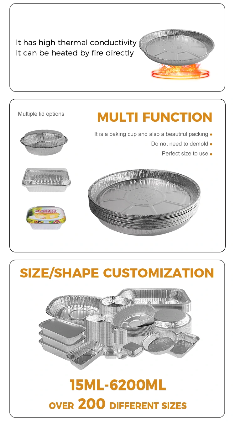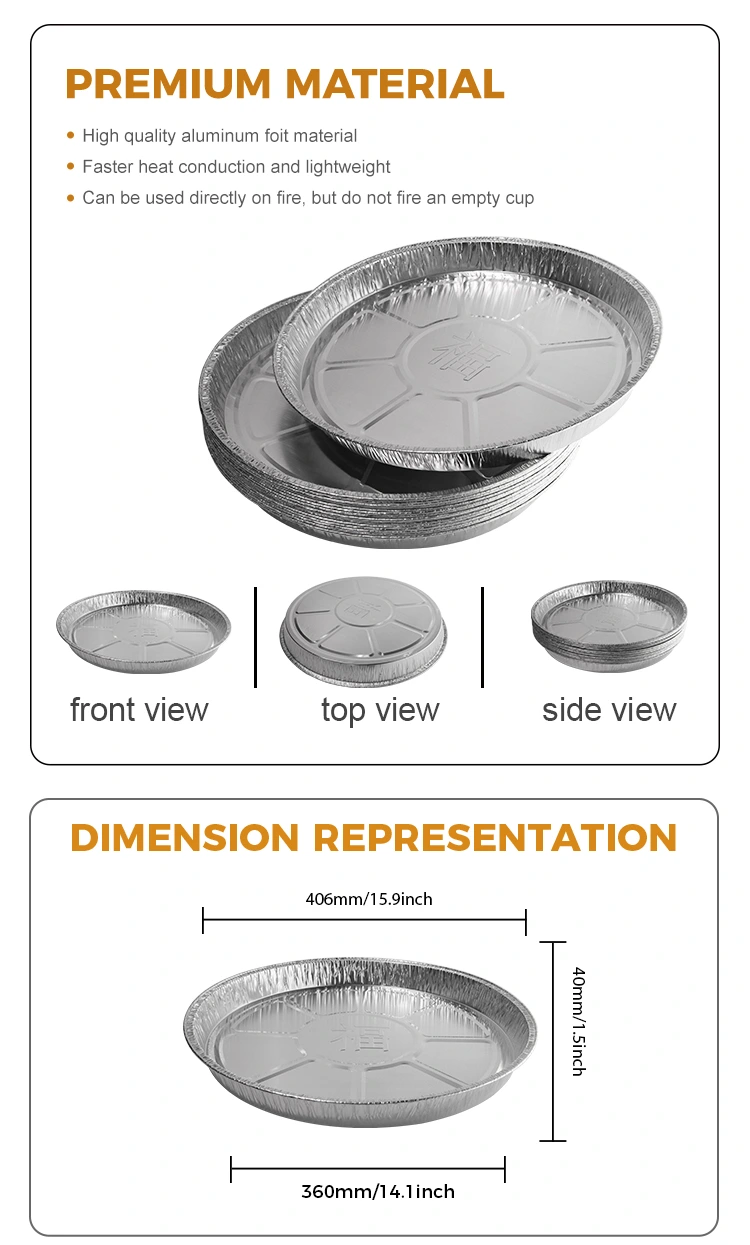 Иунцху алуминијумски добављач модела ИР3700 ИР3700 За једнократну површину Фриер Силвер Силвер Алуминијумска контејнер за фолију Фолија је дат. Контејнер има пречник од 406 мм (око 15,9 инча) на врху, пречника 360 мм (око 14,1 инча) на дну, висина од само 40 мм (око 1,5 инча) и капацитет од око 3,700 мл (око 130,5 оз). Отворено пламен пари је прикладно и хигијенско, печење пећнице, висока температура отпорност 400 ° Ц није спаљена или се поквари, не плаши се масног и вољног роштиља, због његове способности да се директно контактирају отворени пламен, корисници не морају да брину о безбедносним и вољним пламену. Контејнери за фолију алуминијума су отпорни на високе температуре, високо отпорне на печење и нису лако сагоревати или прекинути. Ивица целокупног рола је без уља, спречавајући да се храна залијепи на зид лонца, а заштита је интијанија.