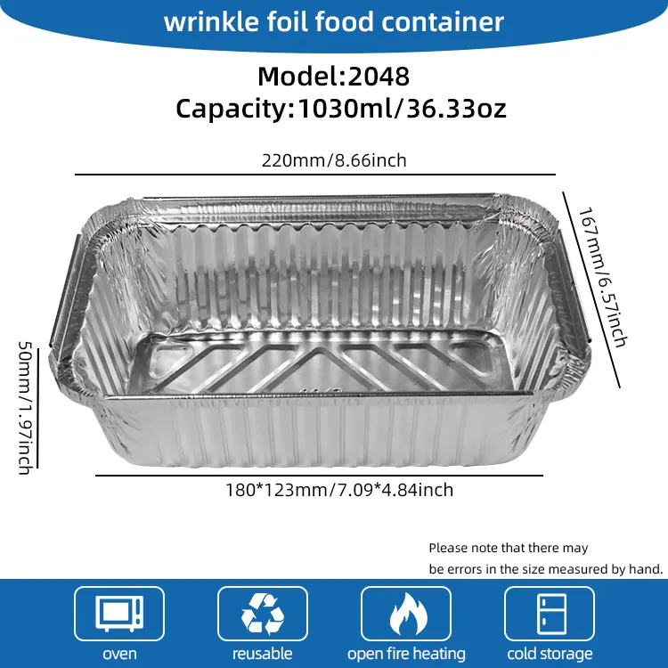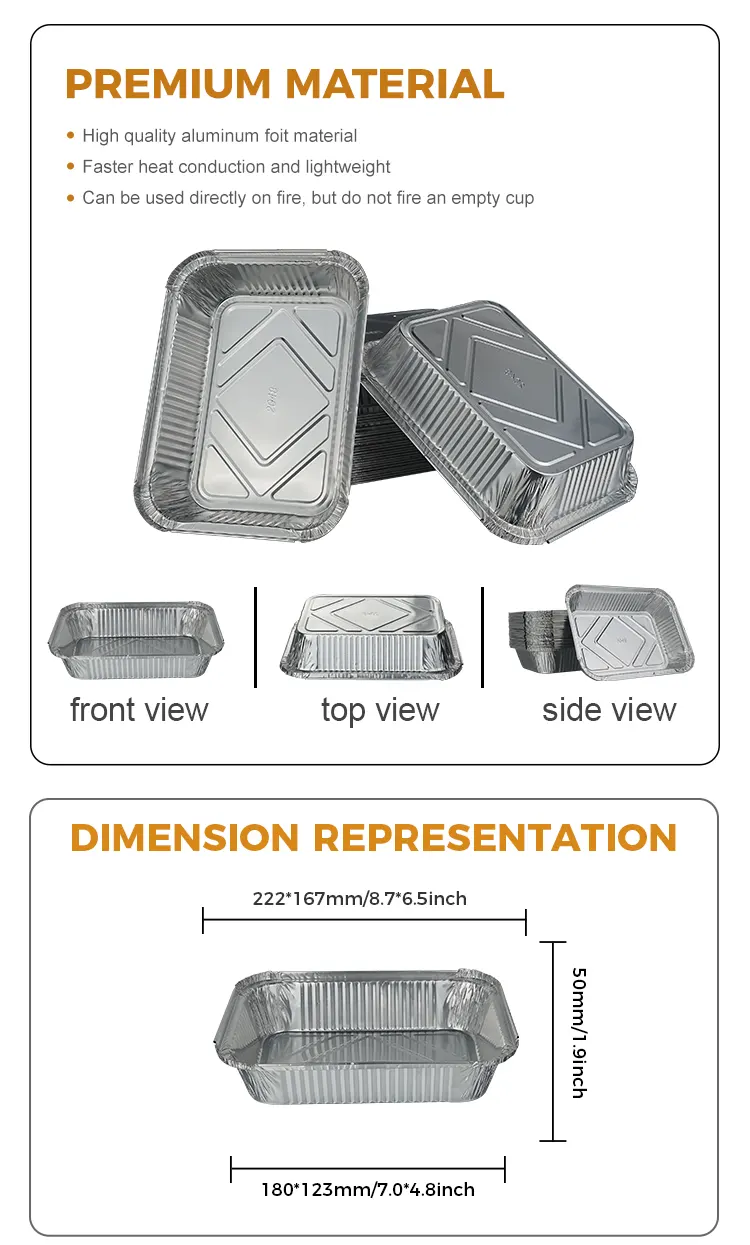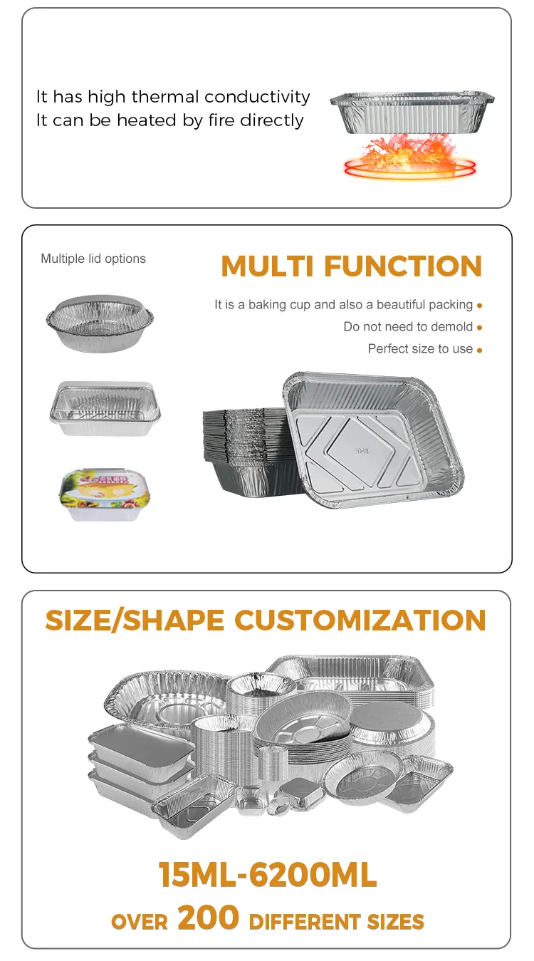 Кутија за ручак од сребрне алуминијумске фолије за једнократну употребу фабрике алуминијумске фолије Иунцху је погодна за већину сцена, било да се ради о ресторану са роштиљем, западном ресторану, ресторану домаће кухиње или пекари, ова кутија за ручак од сребрне алуминијумске фолије може побољшати ефикасност. Роштиљ ресторани могу директно да га користе за сервирање ражњића на жару, поврћа на жару и морских плодова са роштиља. Сребрни изглед је упарен са мирисним састојцима. Има пун визуелни утицај и привлачи погледе када се служи. Дизајн без чишћења смањује оптерећење прања посуђа у кухињи и штеди трошкове рада. Посебно је погодан за брзе оброке у време највећег обедовања. Пекаре га користе за послуживање печених колача, колача од јаја и кекса. Могу се пећи директно у рерни и не морају да се пеку након печења. Мењање тањира и њихово директно стављање на продају је погодно уз одржавање температуре и облика десерта; домаћи ресторани се могу користити за понети, а дизајн који не пропушта цурење може ефикасно спречити проливање супе. Очување топлоте алуминијумске фолије може продужити време константне температуре хране. За камповање, пикнике, роштиљање на отвореном и проблеме са ношењем гломазног посуђа и чишћењем после јела, ова кутија за ручак од алуминијумске фолије за једнократну употребу савршено решава болне тачке путовања на отвореном. Материјал је танак и лаган и лако се складишти. Може се склопити и слагати по жељи, не заузима простор у вашем ранцу и олакшава ношење.