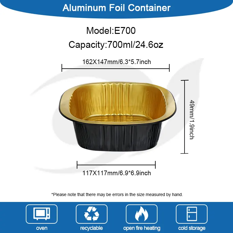 ​Иунцху алуминијумске фолије за једнократну употребу, бинауралне квадратне кутије од црне златне алуминијумске фолије са светлим зидовима направљене су од фолије од алуминијумске легуре 8011 за храну. Обрађени су процесима жарења и стерилизације на високим температурама како би се на површини формирао густи слој оксида. Немају тешке метале и немају мирис. Могу бити у директном контакту са свим врстама хране и спречити таложење штетних материја на високим температурама. Без обзира да ли се користе за држање топлих јела, хладних јела, десерта или сосова, могу да заштите безбедност хране и да буду у складу са вишеструким безбедносним сертификатима као што су ФДА и СГС, чинећи сваки залогај безбеднијим. Јединствени дизајн светлих зидова од црног злата разбија монотону текстуру традиционалних контејнера од алуминијумске фолије. Мат црни златни премаз и глатка површина зида доносе осећај врхунског квалитета. Не само да има изванредан изглед, већ може ефикасно да блокира светлост и кисеоник, одложи оксидацију хране, чврсто закључа арому и влагу хране, избегне пренос мириса и задржи оригинални укус хране дуго времена. Глатка површина зида нема жлебове или боре, што чини мање вероватно да ће размножавати бактерије и лако се чисти. Такође се може боље прилагодити прилагођавању штампања, помажући угоститељским брендовима да побољшају своју препознатљивост и квалитет.