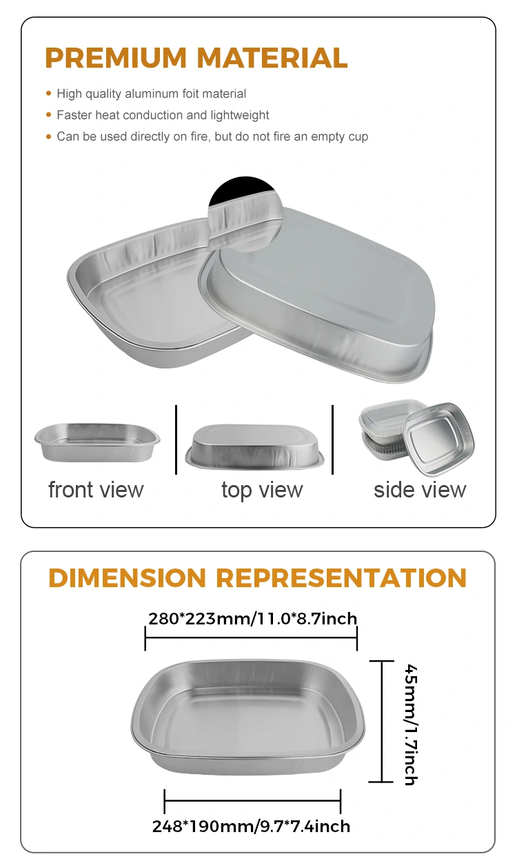 4. Тепсије од алуминијумске фолије за понети имају једноставне и уредне линије, употпуњене модерним сребрним сјајем. Може побољшати визуелну привлачност хране и укупни квалитет, помажући да се ојача професионални и врхунски имиџ бренда.