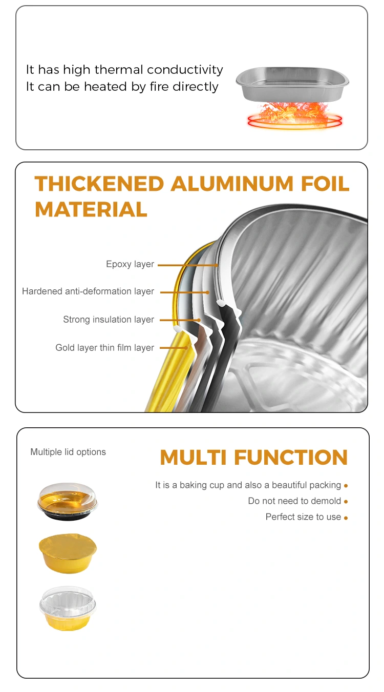 Савршено је паковање за торте са јајима, колаче, колаче, појединачне кришке пице или пецива. Изолационо својство алуминијумске фолије помаже у одржавању топлине и меке текстуре пецива одмах након што се испече; савршено задржава укус и погодан је за понети из пекара и кафића.