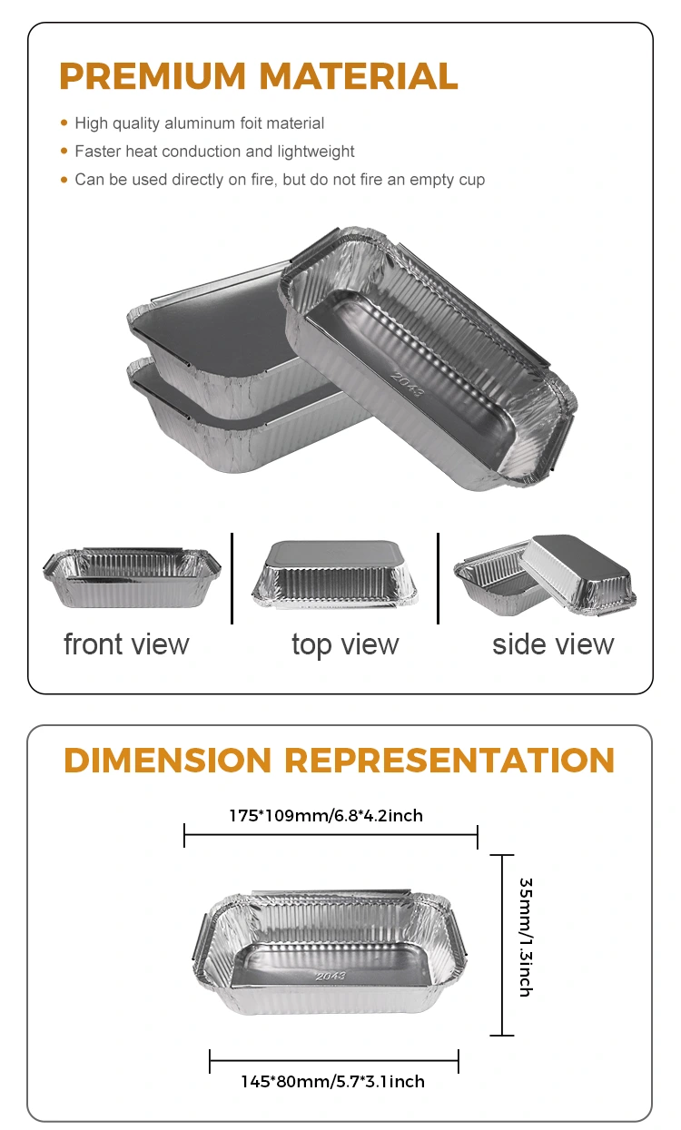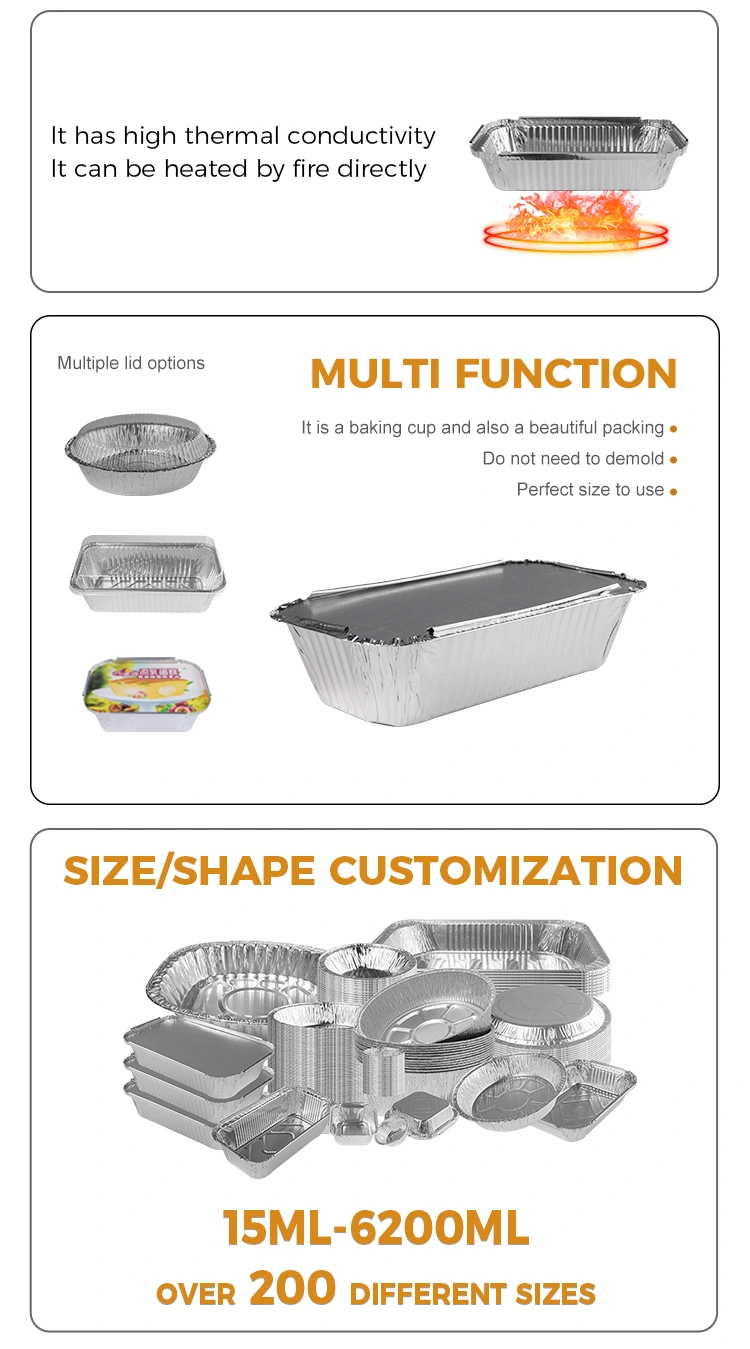 Ова једнократна брза кутија за прекривене боксере Силвер Алуминијумске фолије су направљене од висококвалитетног 8011 алуминијумске фолије, који има добар ефекат очувања топлоте и може да одржава температуру хране, чинећи храну укуснијим и укусним. Поред тога, наш правоугаони ббк сребрни контејнер фолије такође је опремљен функцијом топлотне изолације, која се може упарити са алуминијумском фолијом поклопцем или пластичним поклопцем за кућне љубимце, што је прикладно за прилагођени логотип и даље побољшава слику марке.