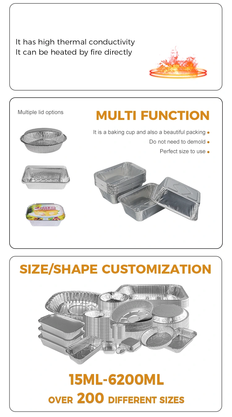 Фабрика алуминијумске фолије за једнократну употребу правоугаоне посуде за печење сребрне алуминијумске фолије направљена је од задебљаног материјала алуминијумске фолије за храну, а унутрашњи зид је третиран премазом за храну. Нетоксичан је, без мириса и не ослобађа штетне материје, чинећи директан контакт са храном безбеднијим. Усклађен је са домаћим и страним стандардима безбедности контејнера за контакт са храном, са температурном отпорношћу у опсегу од -20°Ц до 250°Ц. Може се директно ставити у рерну, фритезу, микроталасну пећницу и фрижидер за замрзавање. Нема потребе да мењате посуду са обликовања у фрижидеру на печење на високој температури. Материјал алуминијумске фолије се може рециклирати и поново користити, што је у складу са концептом зелене заштите животне средине и смањује губитак ресурса. Производ је танак и преносив, може се слагати и складиштити, штедећи простор за складиштење и транспорт. Штеди трошкове када се користи у серијама, узимајући у обзир и практичност и заштиту животне средине.
