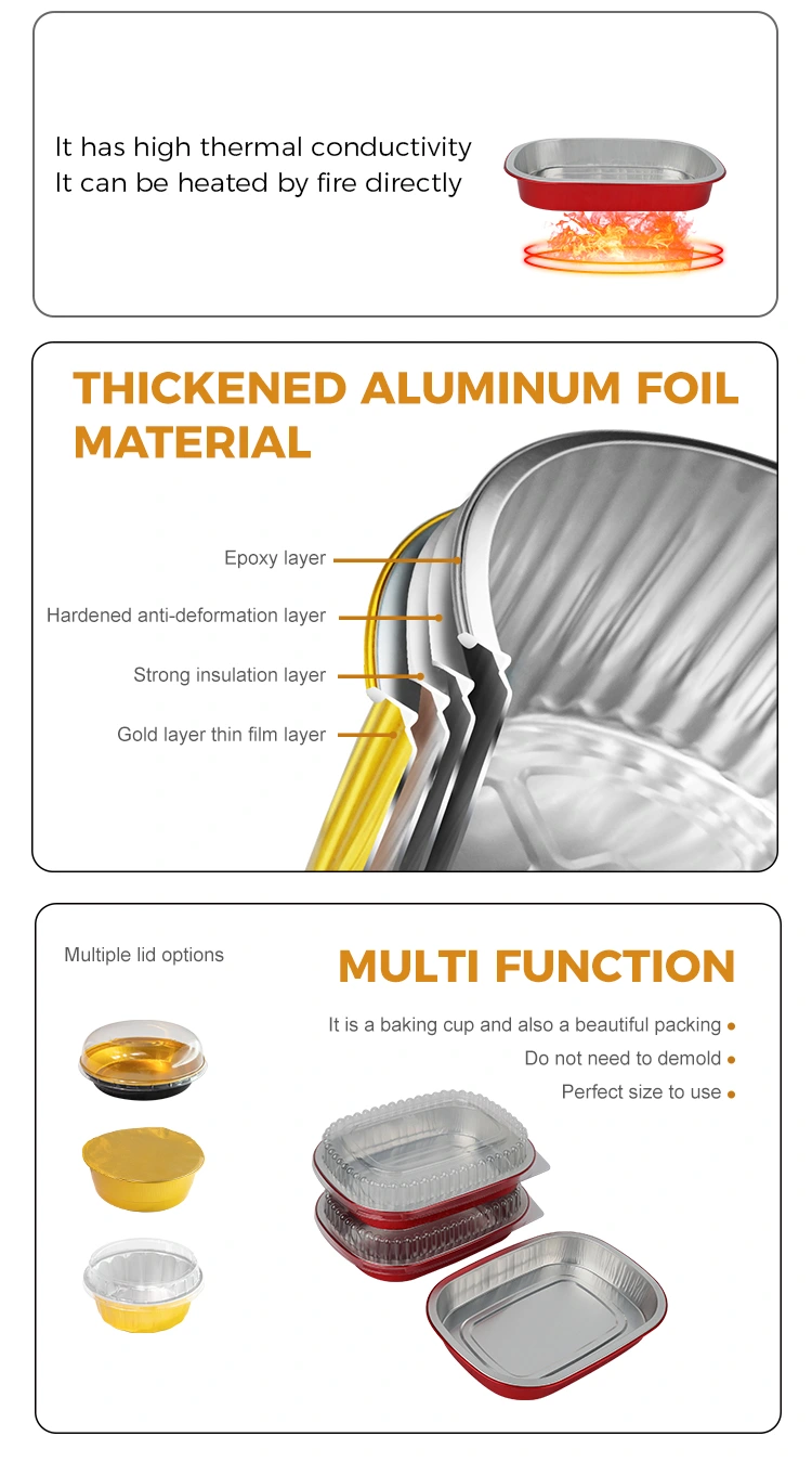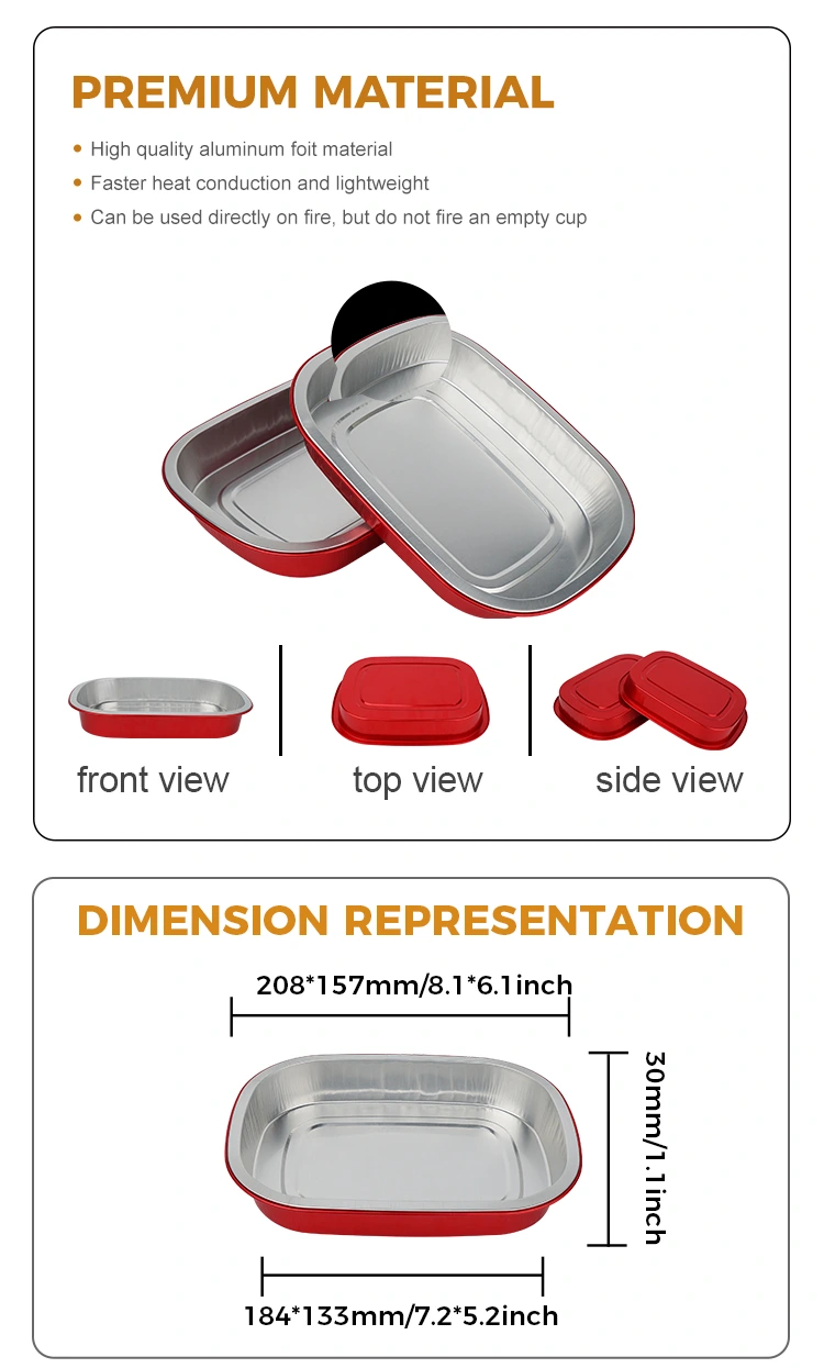 Иунцху је професионални произвођач и добављач контејнера од алуминијумске фолије у Кини. Црвени кутија за ручак за једнократну употребу, квадратни контејнери од алуминијумске фолије које вам нудимо имају пречник од 208*157 милиметара (8,1*6,1 инча). Доњи пречник је 184 * 133 (7,2 * 5,2 инча), висина је 30 (1,1 инча), а капацитет је приближно 680 милилитара (23,9 оз). Он усваја основни материјал од алуминијумске фолије за храну 8011 за храну, који узима у обзир и жилавост и носивост, није лако деформисати или цурити и може директно да подржи храну. Компатибилан је са ултра широким температурним опсегом од -20℃ до 220℃. Није потребно вађење из калупа. Може се директно ставити у рерну, фритезу или пару за употребу, а такође се може хладити ради очувања. Нуди погодно искуство на једном месту "печење - складиштење - потрошња - одлагање". Основна предност алуминијумске фолије је њена висока топлотна проводљивост. Златни премаз помаже у прикупљању топлоте, осигуравајући да се храна загрева равномерно и брзо.