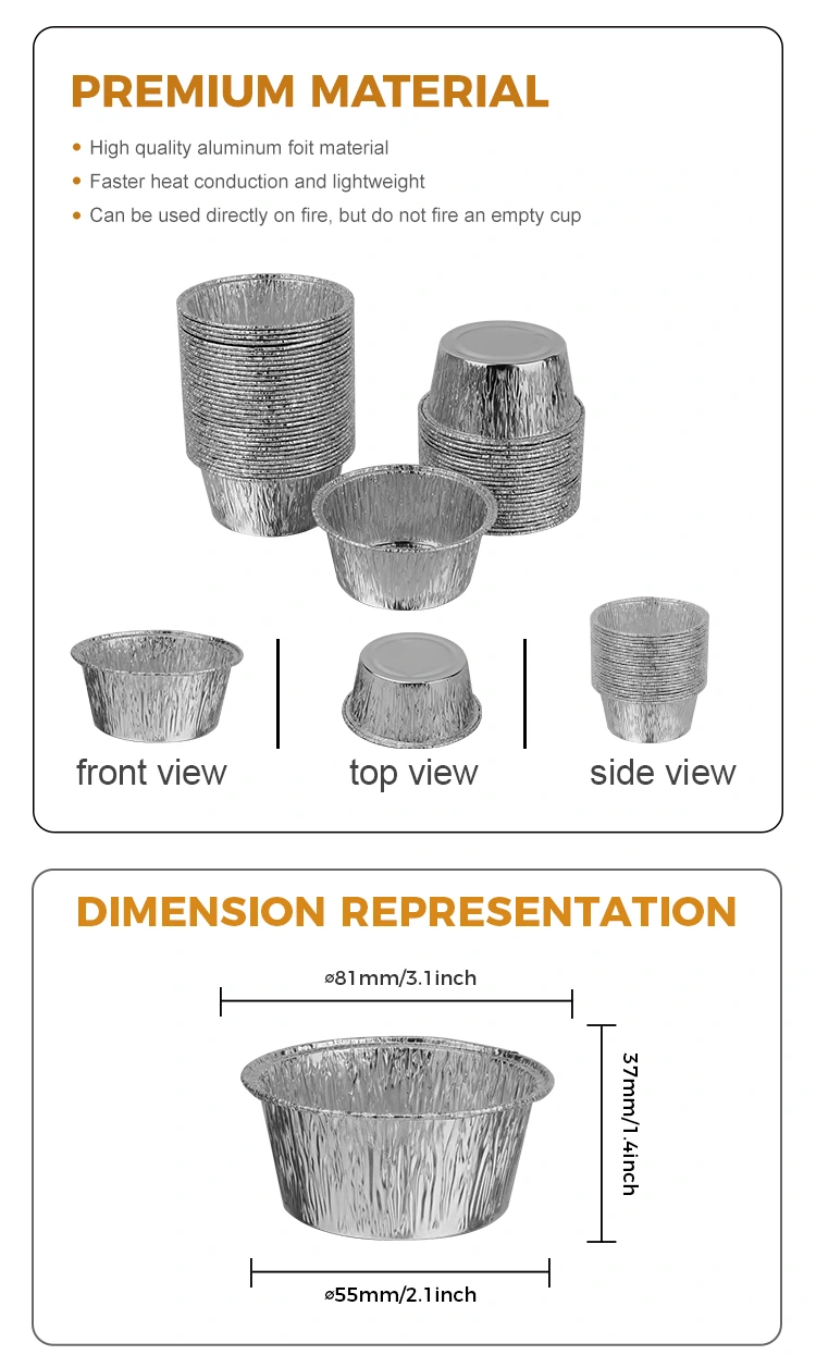 Ова округла посуда за торте од сребрне алуминијумске фолије за једнократну употребу има набране облике око себе што олакшава руковање и погодна је за прављење разних делиција, било да се ради о колачима, пудинзима или јајима куваним на пари. Контејнер је направљен од висококвалитетног материјала алуминијумске фолије са глатком и деликатном површином и лако се чисти. Поред тога, овај материјал такође има добру отпорност на високе температуре и може да издржи температуре изнад 200°Ц, обезбеђујући безбедно кување хране.