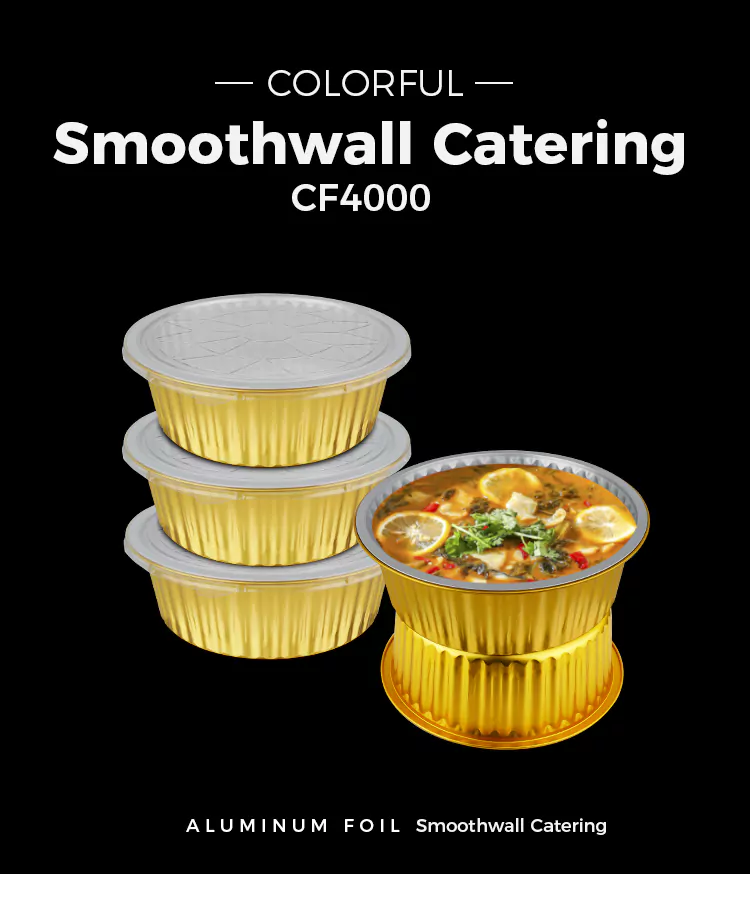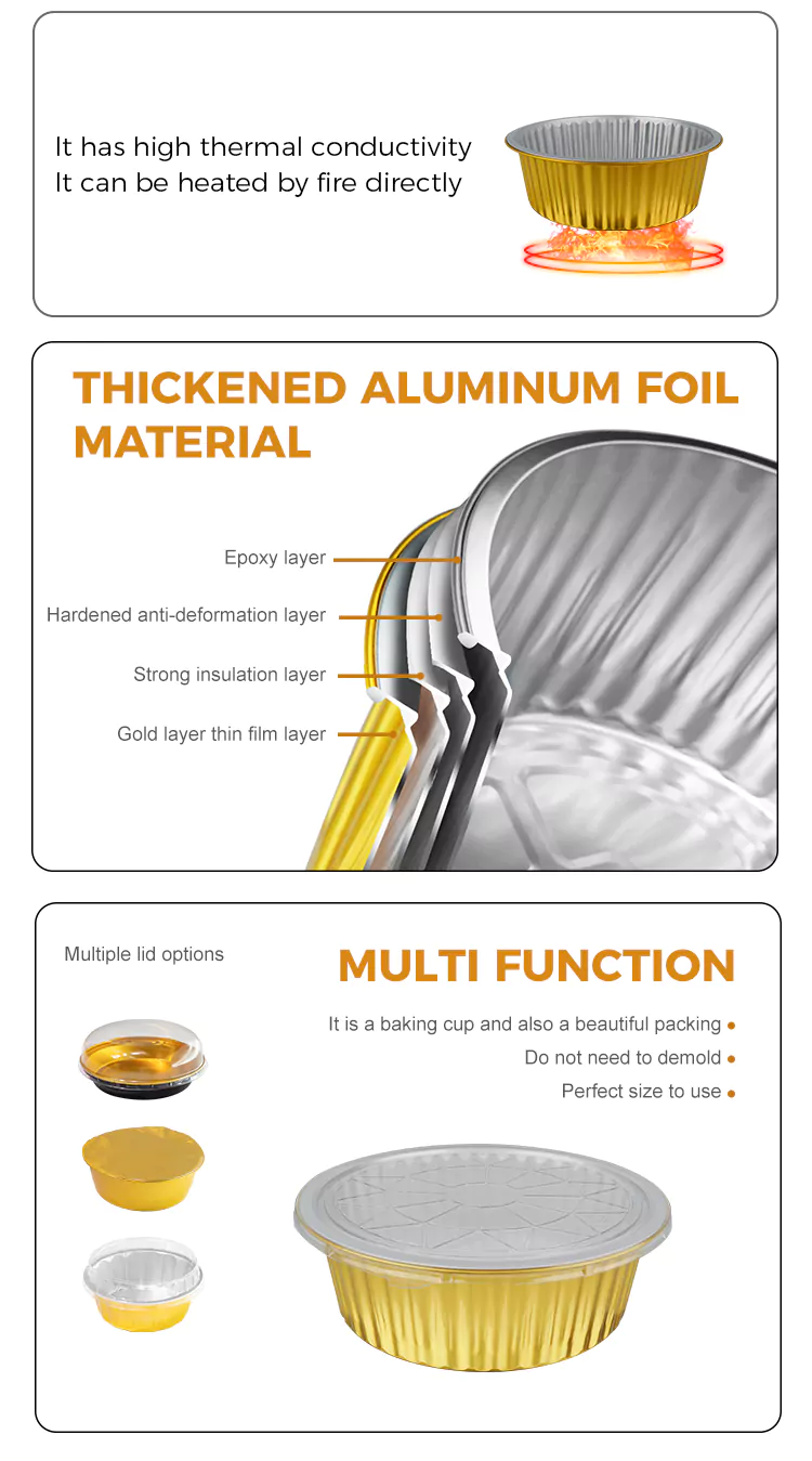 Округли контејнери за једнократну употребу од златне алуминијумске фолије великог капацитета од алуминијумске фолије Иунцху направљени су од основног материјала од легуре алуминијума 8011 за храну кроз прецизно ваљање и процес формирања у једном комаду. Спољни зид посуде је глатки и може безбедно директно да дође у контакт са храном. Чак и када се држи кисела или масна храна, може да одржи стабилност материјала и не остави трагове мириса.
