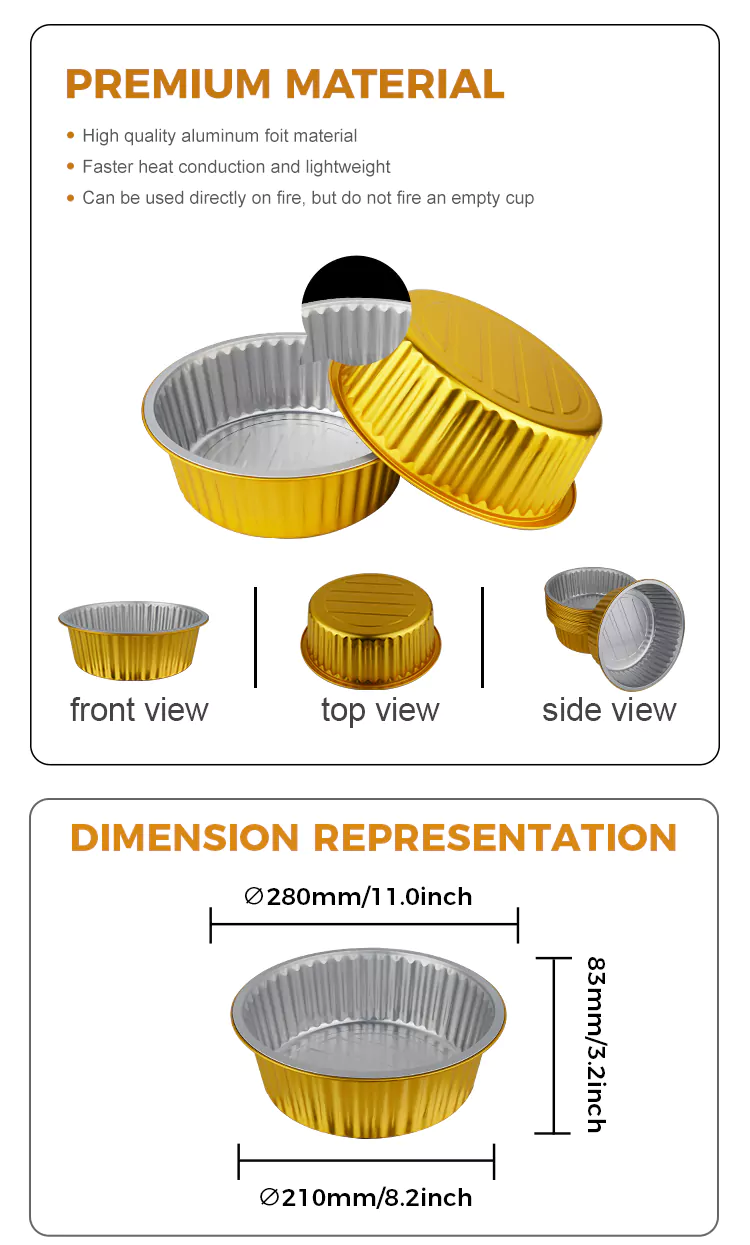 Иунцху алуминијумска фолија вам испоручује висококвалитетне округле посуде од алуминијумске фолије великог капацитета за једнократну употребу. Усвојили смо дизајн који привлачи погледе, чинећи их високим нивоом изгледа и практичности. Сценарији апликације укључују кућне кухиње, угоститељске фирме, студије за печење итд.