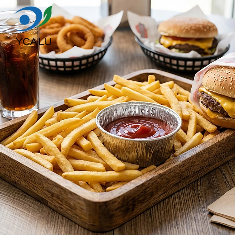 Добављач алуминијумске фолије за једнократну употребу, округли сос за једнократну употребу, сребрна посуда од алуминијумске фолије за храну Материјал алуминијумске фолије за храну, без мириса, без остатака тешких метала, у складу је са стандардима за контакт са храном, високе чистоће и стабилних хемијских својстава. Чак и ако је напуњен киселим сосовима и загрејан на високим температурама, неће испуштати штетне материје, а можете се осећати потпуно безбедно када сте у директном контакту са храном. Производ је прошао ФДА сертификат за храну и стриктно прати ФДА 21 ЦФР стандарде, након професионалног тестирања миграције и детекције тешких метала, садржај штетних супстанци као што су олово и кадмијум је далеко испод безбедносног прага, а квалификације су потпуне. Без обзира да ли је за кућну или комерцијалну употребу, можете безбрижно да бирате. Користите га да делите сосове за маринирање меса, преливе за салату за поврће и јела са сирћетом за умакање кнедле. Порције су праве без расипања. Такође може да избегне пренос мириса и може се уредно чувати у фрижидеру без заузимања простора. Трговци за понети га користе за складиштење сосова, који су запечаћени и непропусни и испоручени купцима чисто. Било да је у питању кечап, слатки чили сос или густи сос од сусама, неће бити непријатности због цурења и прљања хране. Чак и за пикнике и камповање на отвореном, можете понети неколико са собом и користити их за држање сосова за потапање. Лагана је и не заузима простор. Можете га бацити директно након употребе. Не морате да носите гомилу прљавих контејнера кући. Углавном се ради о лакоћи и без проблема.