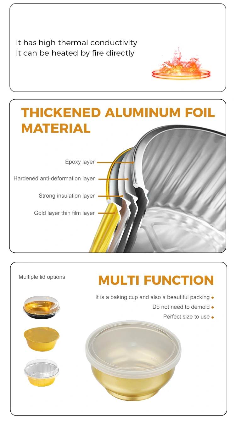 Иунцху алуминијумски добављач фолије, округли за једнократну златну посуду Алуминијумске фолије, задебљана алуминијумска фолија, велика тврдоћа, не лако деформише, може се запечатити, јер је и паковање за стерилизацију на високим температурама, и паковање са високим температурама, има и паковање алуминијумске топлоте - снажна топлотна изолација - јака топлотна изолациона и паковање топлоте - снажна топлотна изолациона. Замрзнута и може се рециклирати. ГРАД-ГРАДЕ ПЕ УНАЛНИ МЕМБРАНИ, МЕТАЛНИ МАТЕРИЈАЛ У УПРАВЉАЊУ ГРАДА ПЕ УНАРНЕ МЕМБРАНЕ, БЕЗ ЗАРНОГ ЈАРНОГ МЕМБРАНА МАЈНИ ЈАР НЕ КАО НИСУ РАСПОЛОЖЕНИ, ПАОЧНОМ ЗАЈЕДНИЦУ, Снажне заштите за бртвљење чврсто, чврсто одржава свјежину производа дуже време, снажно бртвљење које је дуже време у боји дуже време. Округли за једнократну употребу Алуминијумски фолијски посуђени контејнери се широко користе у разним прехрамбеним индустријама, као што су фабрике прехрамбених производа, фабрике бомбона, сушене фабрике, пекаре, специјалитет продаваонице хране и сушеним воћним, сушеним шљивим, сушеним воћом, сушеним воћом, осушени воћке, сушене, чврсте, течно и чврсте сушене плодове.