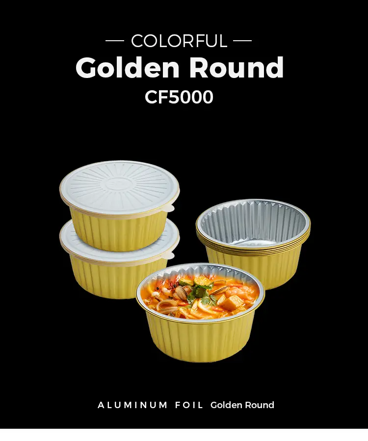 Yunchu Aluminum Foil Disposable Sealable Golden Round Aluminum Foil Containers Model CF5000 Supply Wholesale has a wide range of uses, can use the covered aluminum foil heat sealing lid for baking, storage, transportation, and supply of all kinds of assembly line food, etc., from pre-made dishes and cleaning all kinds of food to supplier food, this container is suitable for a variety of occasions, such as large supermarket продавнице, забаве, угоститељске активности, угоститељске продавнице самопослуживања, итд., Започињена златна коприва Алуминијумска фолија Контермани од висококвалитетног алуминијумске фолије од висококвалитетних 80-0-0, копач за печење за једнократну употребу са поклопцем са поклопцем, не лако се пробије или оштећује или оштећено. Материјал омогућава једноличну расподелу топлоте, добро задржавање топлоте, без лепљења, безгореног, водоотпоран и отпорна на уљем, нема потребе за чишћењем, без оптерећења на уљним мрљама. Глатке ивице не штете вам рукама, осигуравајући да се претходно припремљена јела у потпуности кува; ФОИЛ Пан је завршена у елегантној златној боји која повећава презентацију и допуњује вашу кухињу или догађај.