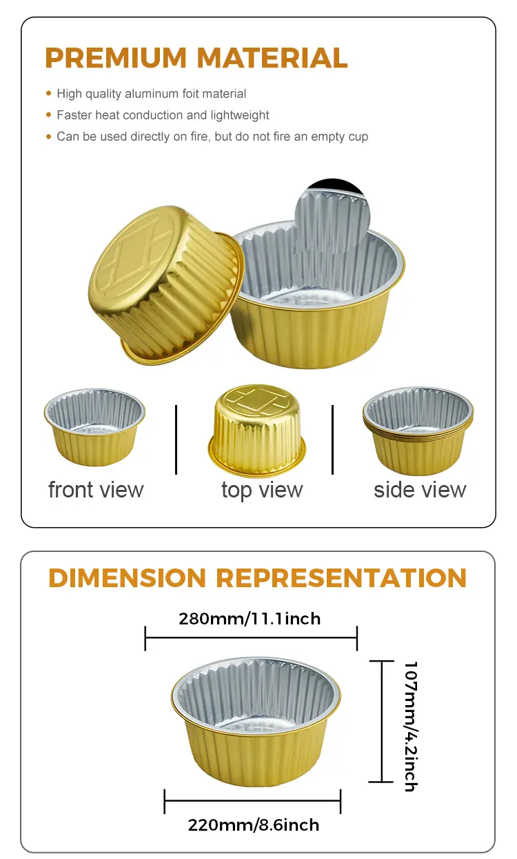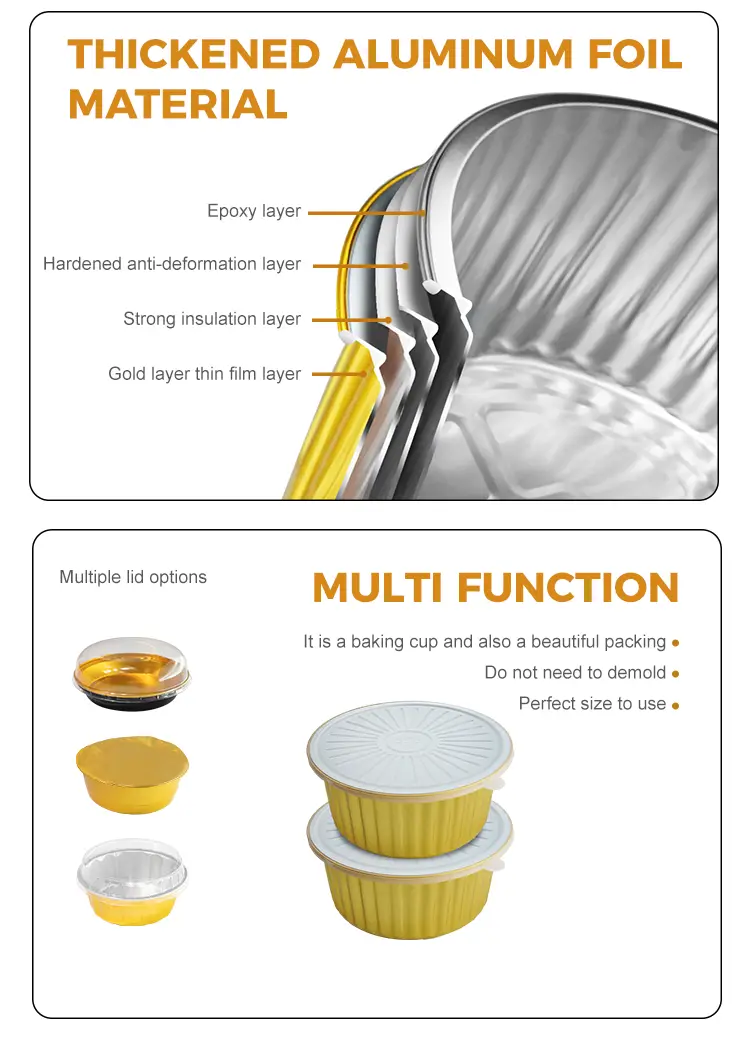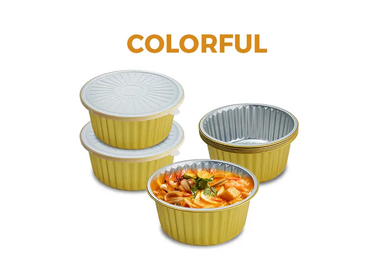 • Златни округли фолијски контејнери за једнократну употребуЗлатни округли фолијски контејнери за једнократну употребу