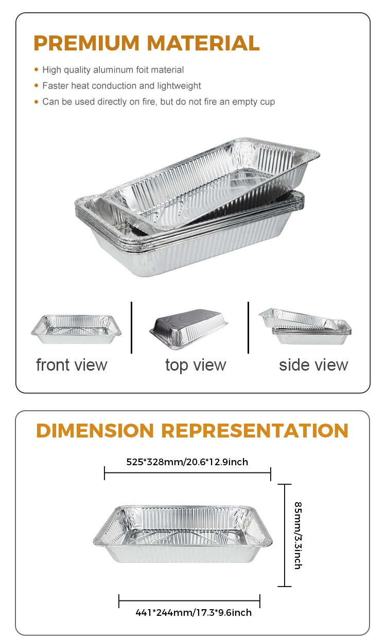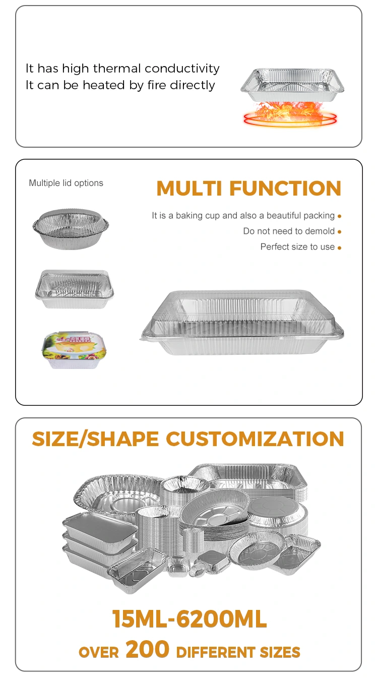 Карактеристике: Овај велики капацитет Вањски контејнер за печење на отвореном Средња контејнер фолије је направљен од алуминијумске фолије од 8011-0, који у потпуности испуњава контакт стандард за храну, обезбеђујући сигурност хране без осебујног мириса и више их је потребно користити. Има конкавни и конвексни унутрашњи дизајн, који је сигурнији за употребу. Опрема је без чишћења и добро штити линију опреме. Да ли печење или грејање на отвореном пламену, нема потребе да се бринете о деформацији контејнери или утицаја на сигурност хране.