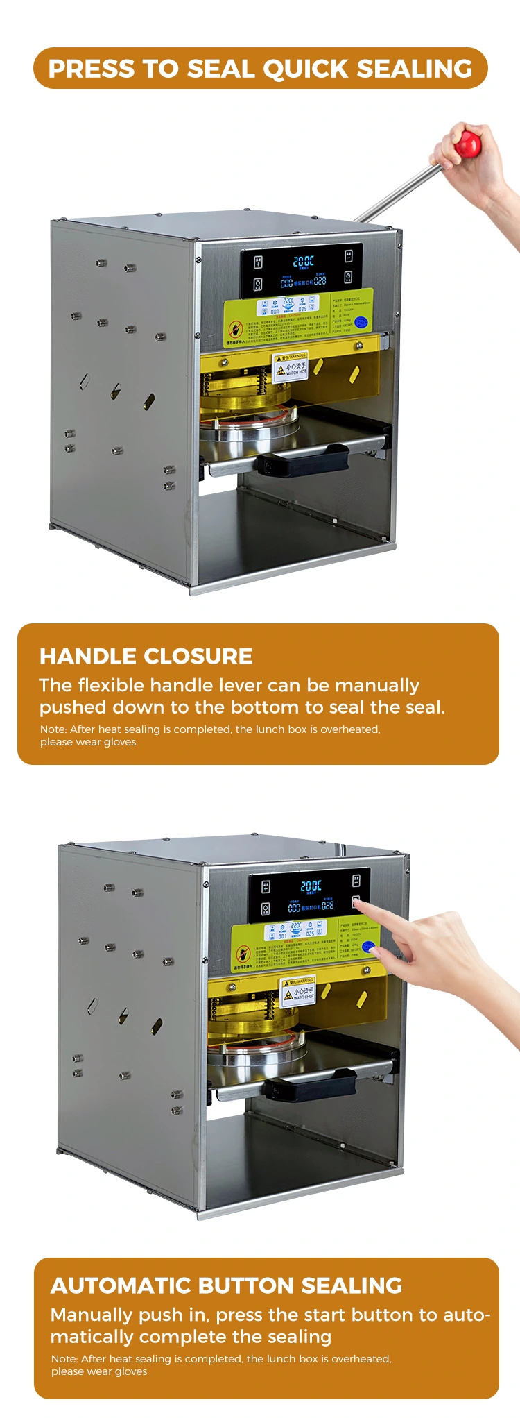 Ефикасније: Нема потребе за упаривање са одвојеним заптивним фолијама. Кутије за ручак и заптивачи су одмах спремни за употребу. Ручни рад не захтева чекање на предгревање. Поруџбине мале серије могу се брзо обрадити, а велике поруџбине се такође могу стално напредовати. Може лако да се носи са сценаријима као што су вршни сати за ручавање и изненадни пораст наруџби на фестивалима.