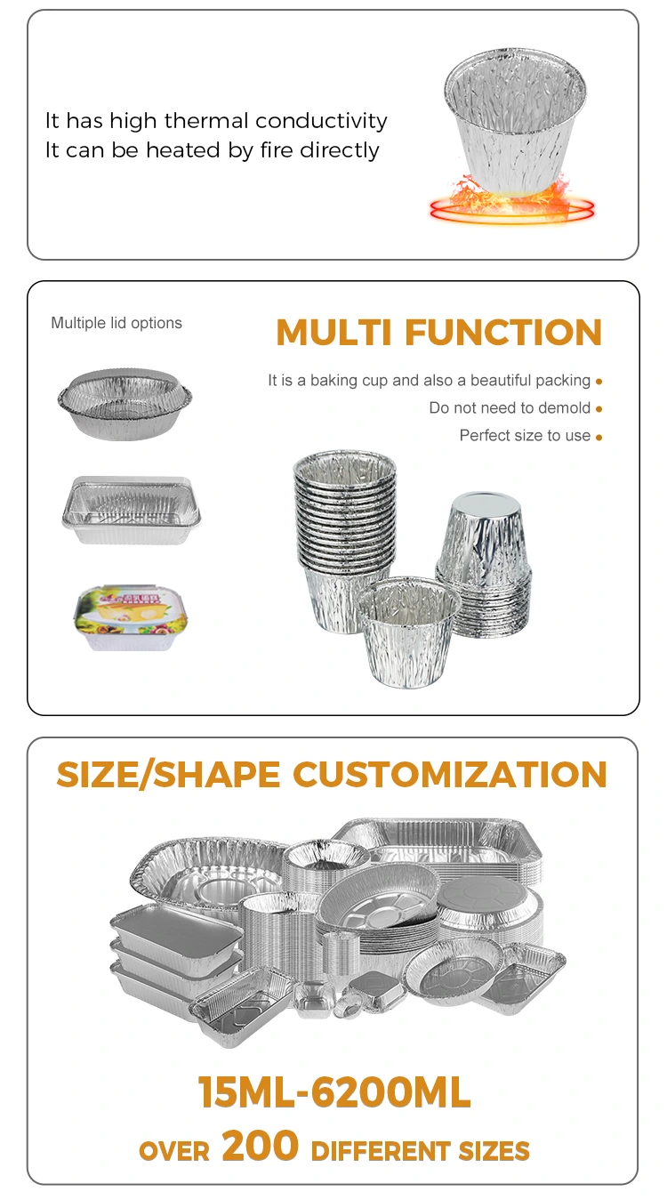 Контејнер од сребрне алуминијумске фолије за једнократну употребу од добављача алуминијумске фолије за пекаре је направљен од материјала за храну, безбедан је и не оптерећује: одабрани материјали отпорни на високе температуре за контакт са храном, без мириса, без штетних адитива, стриктно испитивање квалитета и може бити у директном контакту са састојцима хране. Без обзира да ли се пече на високим температурама -20℃~220℃) или на пари у пари, стабилан је и не деформише се и не ослобађа штетне супстанце, дајући породици и пријатељима сигурнију и укуснију гаранцију.