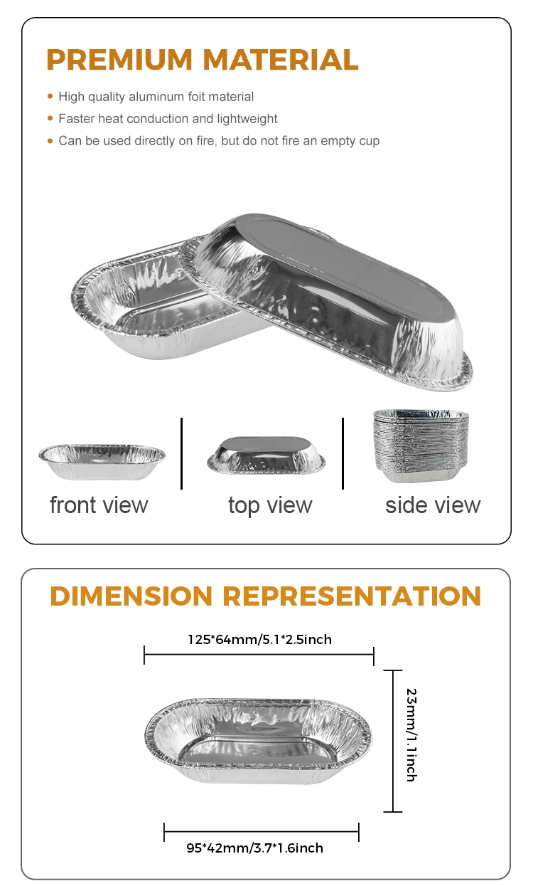 Иунцху овална пецачка контејнер за прехрамбене фолије је врло скромна величина, са горњим пречником од 125 * 64 мм (5,1 2,5 инча), базни пречник од 95 к 42 мм (3,7 ° 1,6 инча), висина од само 23 мм (1,1 инча) и капацитета од 105 мм (3,7 оз). Ова величина није само лако носити, већ и може да испуни различите потребе за различитим употребом.