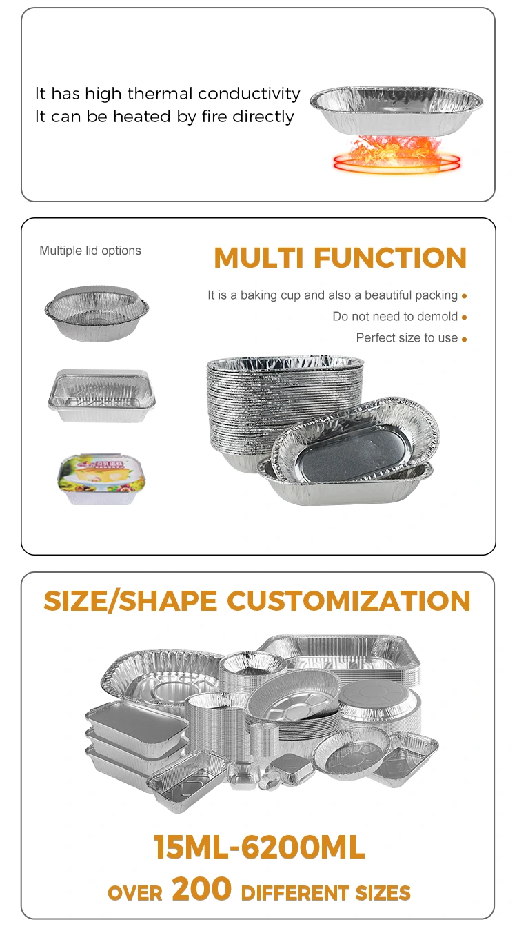 Због свог малог и лаганог дизајна, овална контејнер за прехрамбене фолије у облику гуаст-сребрне алуминијума је савршен за ношење и складиштење хране, погодно за употребу хране и прилагођавање хране у продавницама, ресторанима брзе хране и још много тога. Конкавни и конвексни дизајн текстуре на дну помаже да се побољшају трење и равномерно дистрибуира топлоту и избегне локално прегревање. Поред тога, кутија за алуминијумску фолију је задебљана како би се побољшала отпорност на компресију и издржљивост и може остати стабилан чак и током транспорта и није лако деформисати.