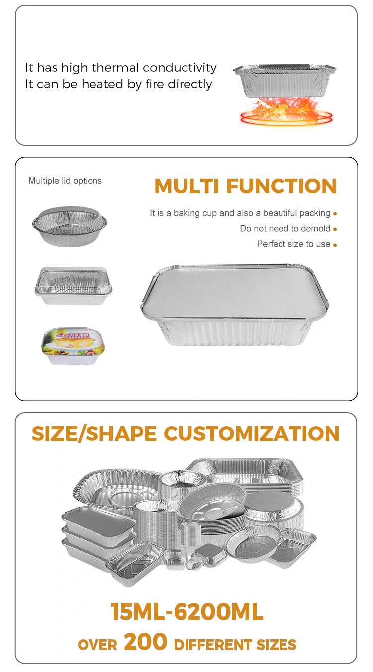 Иунцху алуминијумска фолија Овај правоугаони ваздушни фриер паковање сребрних алуминијумских фолије контејнери од висококвалитетних 8011 алуминијумске фолије, који има одличну перформансе топлоте и ефикасно одржава температуру хране, чинећи храну укуснијим и укусним. Истовремено, наш правоугаони ббк сребрни контејнер за фолију такође је опремљен функцијом очувања топлоте, која се може постићи подударањем са алуминијумским фолијским поклопцем или пластичним поклопцем за кућне љубимце, што је прикладно за прилагођени логотип и на тај начин се повећава имиџ марке.