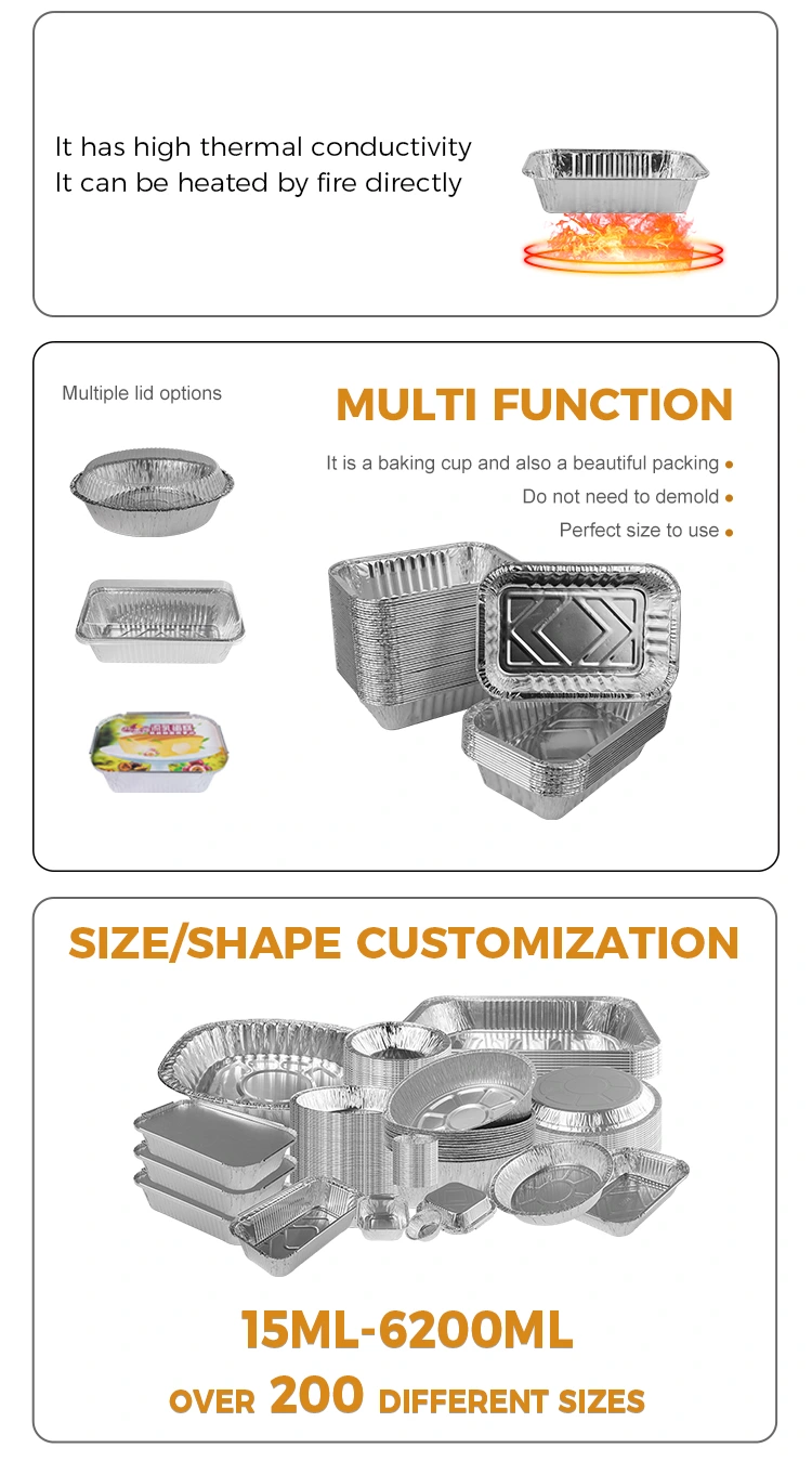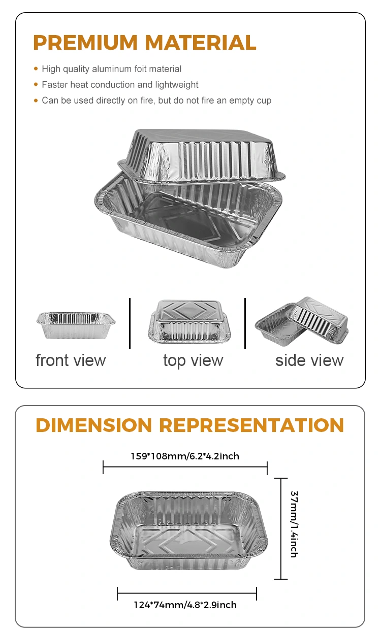 2322 Правокутни контејнер за печење ливере сребрне фолије из добављача фолије Иунцхеу Алуминиум је произведен са материјалом од алуминијума хране, који обезбеђује сигурност и природу хране без мириса. Производ је без чистих и рециклирајући, дајући вам више душевног мира када га користите. Има димензије 159 мм (6,2 инча) и 108 мм (4,2 инча) горњих пречника, 124 мм (4,8 инча) и 74 мм (2,9 инча) доњих пречника, висок 37 мм (1.4 у) и капацитет од приближно 400 мл (14.1 оз). Алуминијумске кутије за фолију имају одличне функције очувања топлоте, посебно погодне за контролу температуре у претресама и шопинг тржним храном, било да је то мали колачи или воћни материјали.
