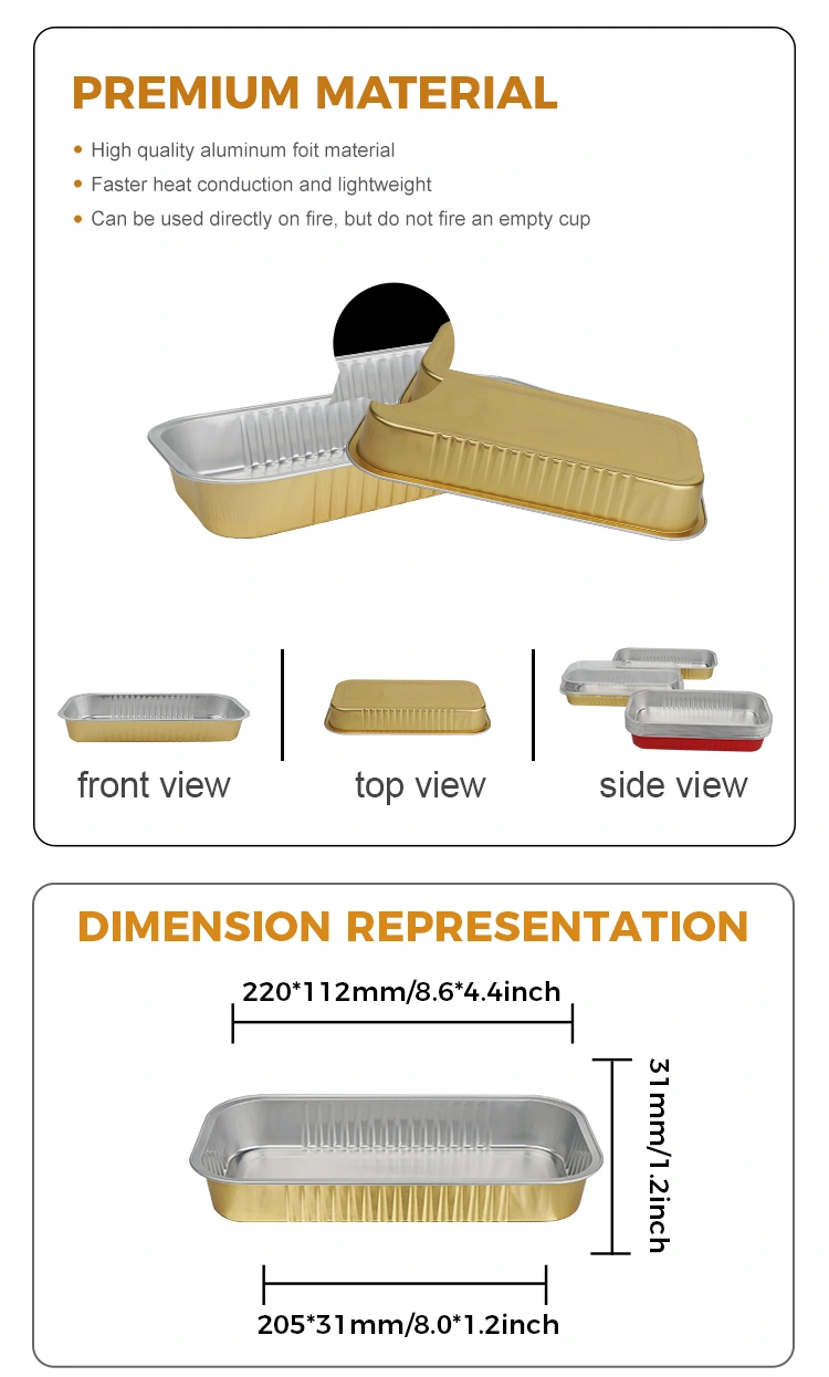 Кетеринг за понети: погодан за доставу лаких јела у западном стилу и печених десерта. Златни изглед побољшава имиџ бренда, а материјал алуминијумске фолије такође може играти одређену улогу у очувању топлоте.