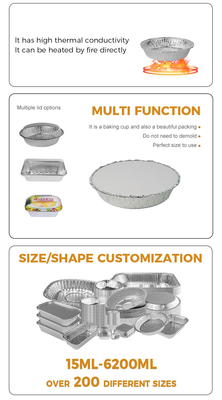 Карактеристике: Једноделни обликовање задебљане и печене отпорне, усвајају се алуминијумски фолијски материјал за контакт, остало је да се обратите конформишењу хране, а не лако дебљине, а не процурите, јаку дебљину, отпорност на високу температуру.