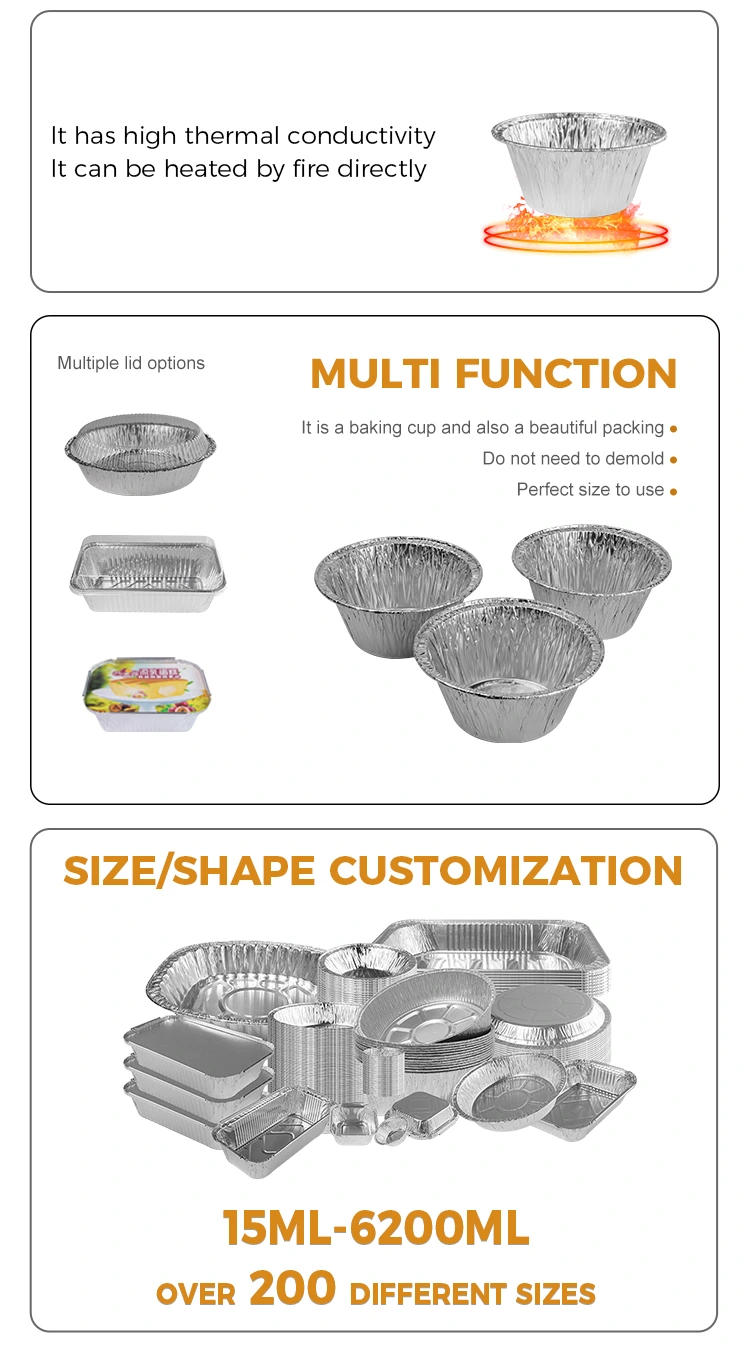 Карактеристике: Округла пећи торта Сребрна алуминијумска фолија Контејнер за храну је здрав и еколошки прихватљив, не треба да се очисти, погодан је за израду различитих кућних печених грицкалица, а такође је потребан производ за пекаре, а алуминијумски фолијски материјал је сигуран и хигијенски, без чишћења, може се пети на отвореном пламену.