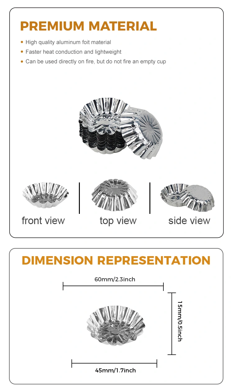 Иунцху алуминијумска фолија за фолијуи округлих јаја ТАРТ играчка Силвер Силвер Алуминијумска фолија фоока. Ова ладица за јаја не само изгледа само прелепо, већ и посебну пажњу посвећује практичности и безбедности. Ова ладица за јаја одликује дизајн неклизавања са не-клизном текстуром која повећава трење и ефективно спречава да искриви храну, чинећи ваше резултате печења стабилнији. Друго, дизајн уста чаше за чипке може се савити и складиштити, што је и уштеда простора и преносив, чинећи га идеалним за породице или мале угоститељске установе. Лажиште за јаја је направљен од алуминијумске фолије од хране, која се истовремено формира и не треба да се очисти, што увелико побољшава ефикасност употребе. Погодан је за све врсте кухиња, да ли су печене тачке, колачи, јаја и жуманце, колачи посуде, то се може савршено представити. Овај ладица за јаја је положила немачки ЕРП цертификат, ЕУ СГС сертификат и сертификат система за управљање квалитетом ИСО9001, обезбеђујући сигурност и заштиту животне средине производа. Наши сировина су сви здрави и еколошки прихватљиви материјали за храну, који задовољавају међународне стандарде безбедности хране, тако да можете јести са поуздањем.