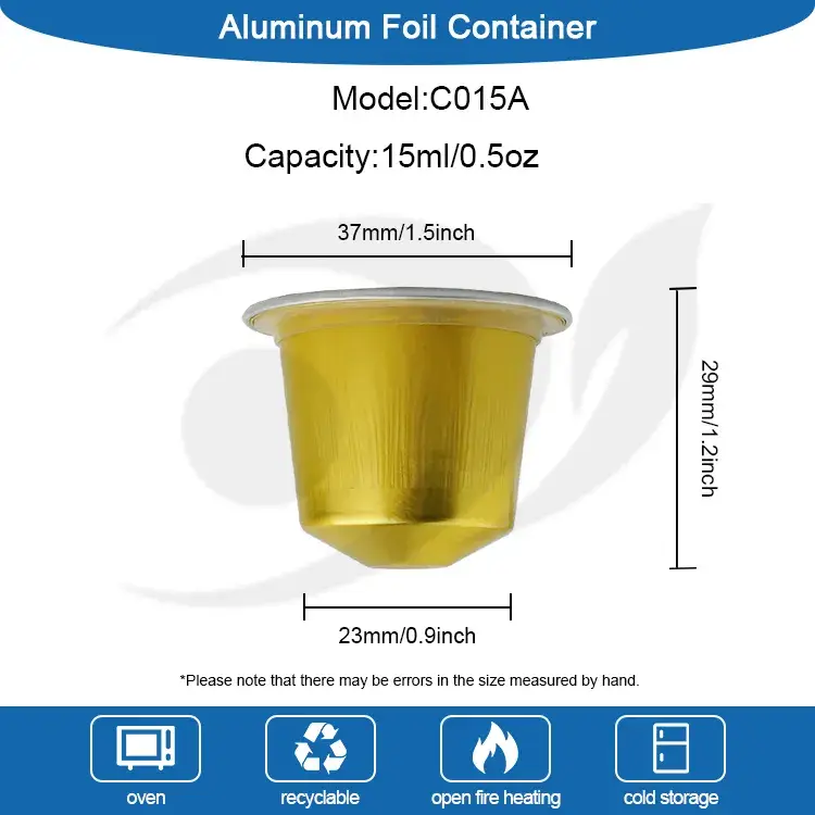 Иунцху алуминијумска фолија за фолијом Силиконски бртви празна капсула за кафу Ц015А у следећим величинама: горњи пречник 37 мм (око 1,4 инча), пречник база 23 мм (око 0,9 инча), висина 29 мм (око 1,1 инча). Ова капсула садржи 15 мл (око 0,5 оз) приземне кафе, кафе течности. Погодно за све Неспрессо машине, паковане еспрессо течности и чак се може проширити и испирање азота. Поред тога, лого и боја се такође могу прилагодити, а узорак се може одштампати на поклопцу алуминијске фолије, а логотип се такође може жигосати на дну кафе капсуле.